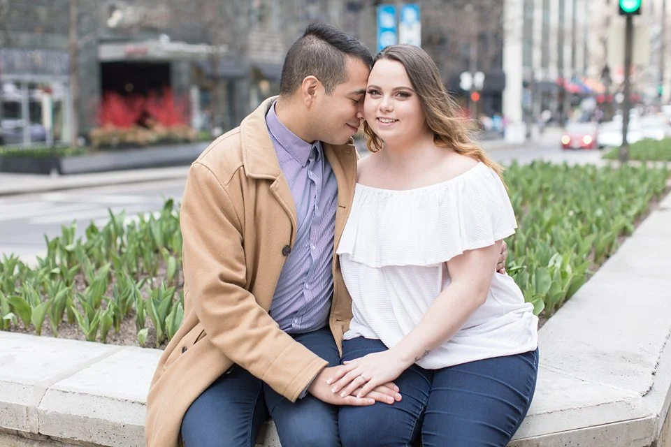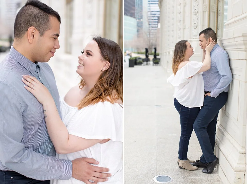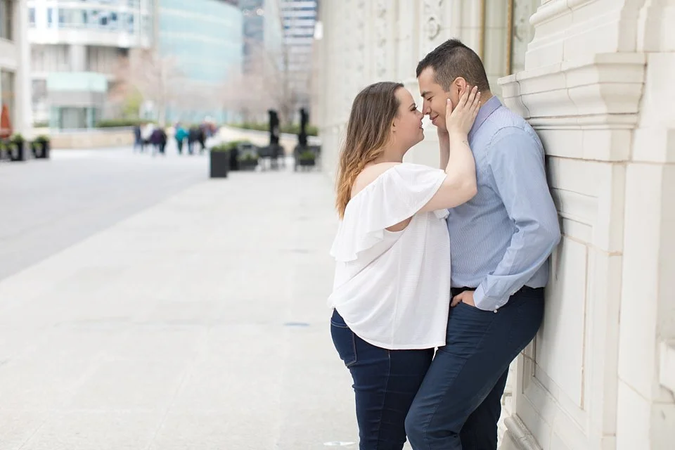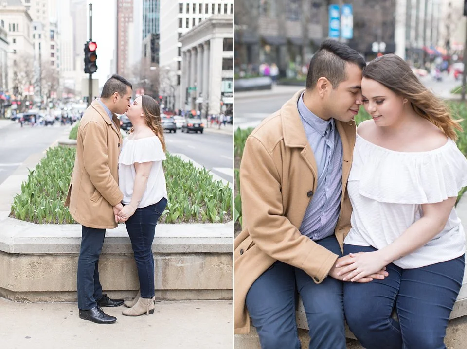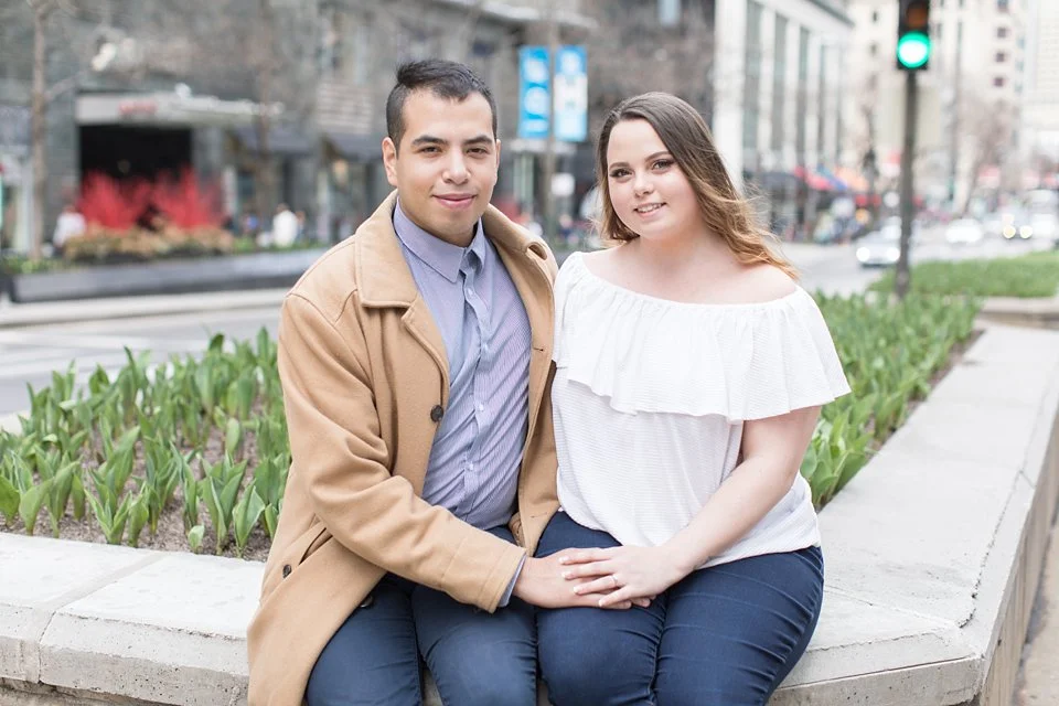 We hit a few key locations during their session, one being Olive Park right next to Navy Pier. I absolutely love shooting at this location because it has such a perfect view of the city skyline, and the walkway that's lined with trees is so pretty! Then we walked over to Michigan Avenue where we found probably my new favorite hidden spot. The Wrigley Building has such amazing detail and the lighting was just perfect! A photographers dream! We continued down Michigan Avenue and ended up right next to the Chicago River to grab a couple of shots. Also, Spring has finally sprung for us to get Melissa's detailed ring shot (another favorite!).