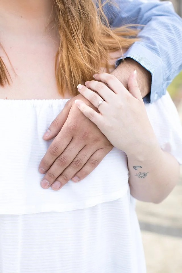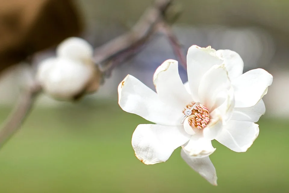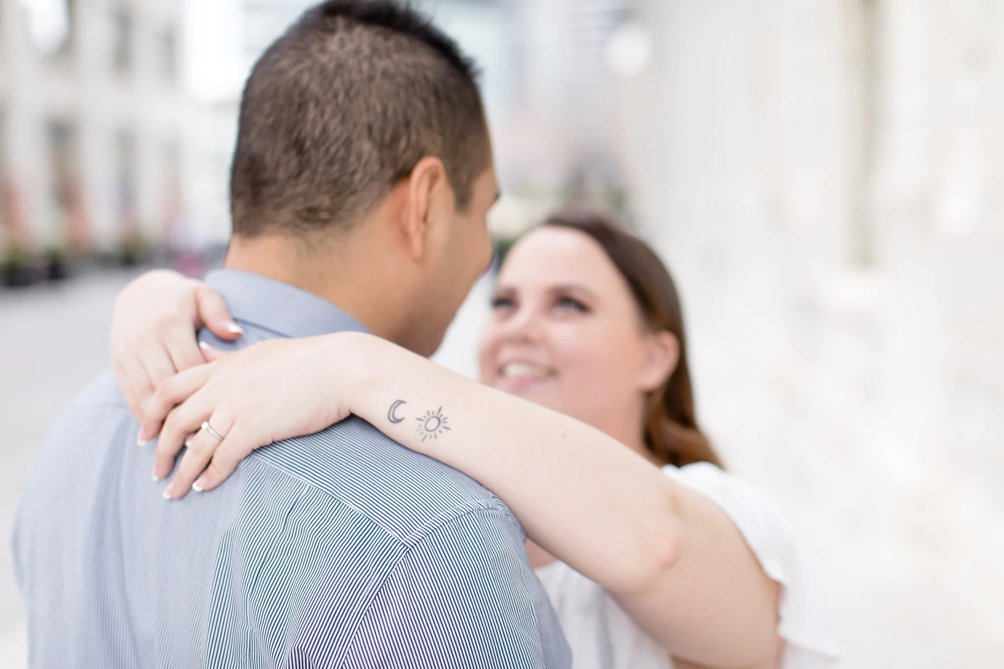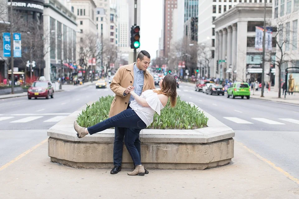 We hit a few key locations during their session, one being Olive Park right next to Navy Pier. I absolutely love shooting at this location because it has such a perfect view of the city skyline, and the walkway that's lined with trees is so pretty! Then we walked over to Michigan Avenue where we found probably my new favorite hidden spot. The Wrigley Building has such amazing detail and the lighting was just perfect! A photographers dream! We continued down Michigan Avenue and ended up right next to the Chicago River to grab a couple of shots. Also, Spring has finally sprung for us to get Melissa's detailed ring shot (another favorite!).