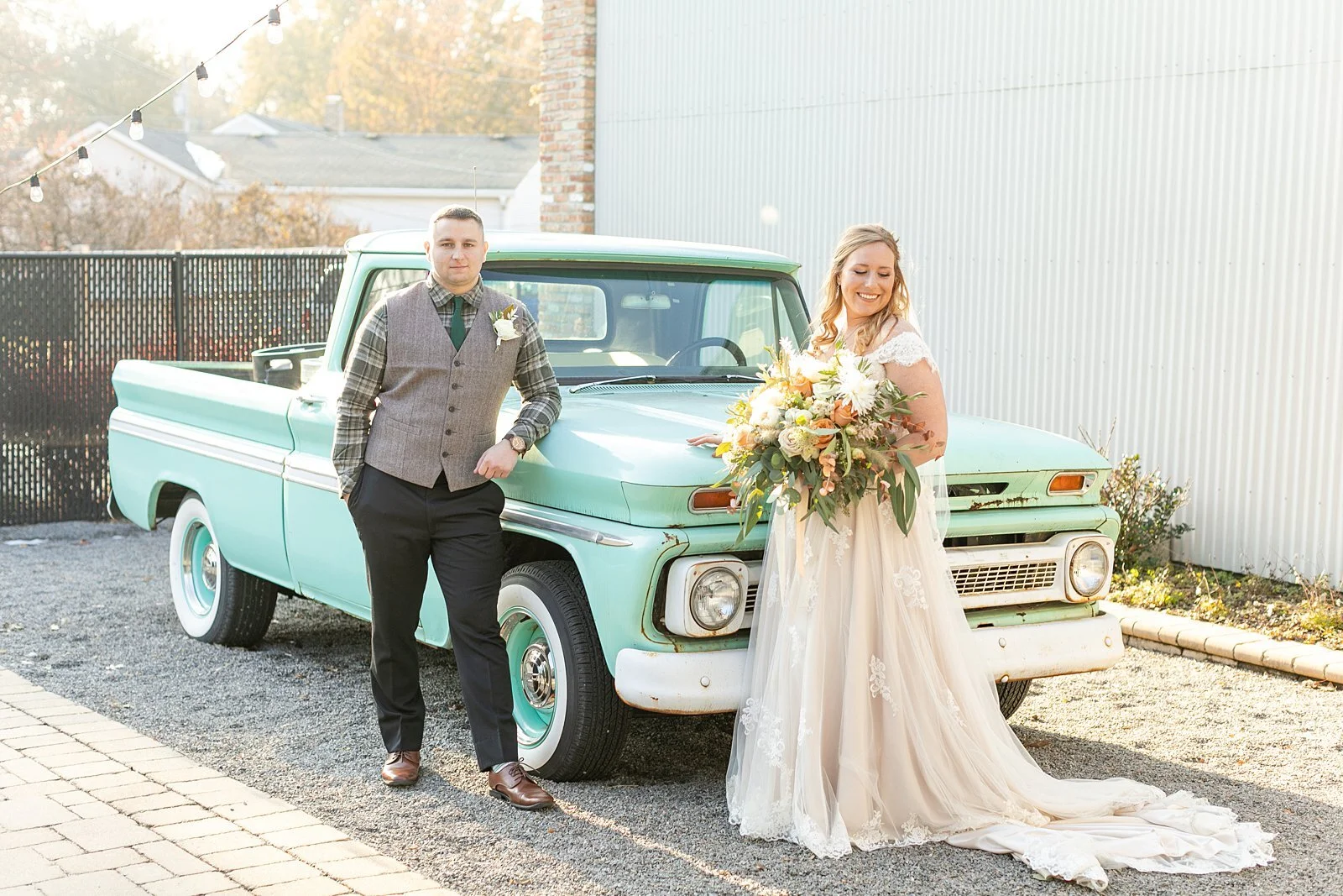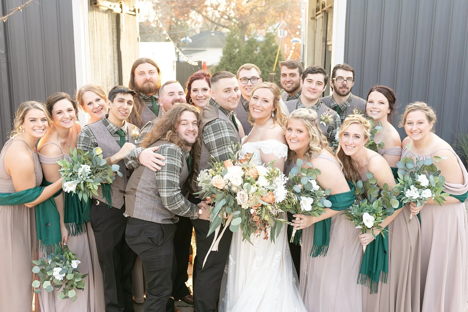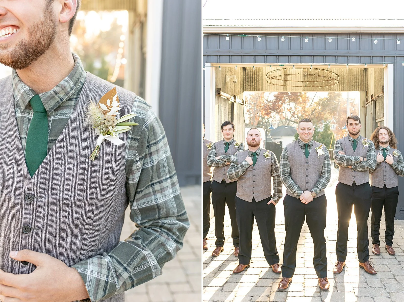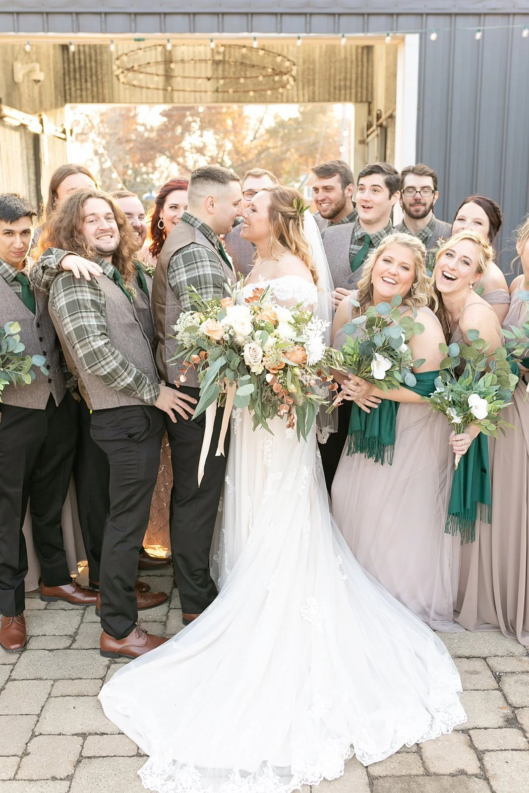It was the most perfect fall day, November 16th. A slight chill to the air, enough for it to feel like fall, but the sun was in full force! Just WAIT until you see their glowy portraits together! UGHHH I’m obsessed! Over the course of a little more than a year, I was getting all the details about how this day was pictured in Mallory’s head. The girls would be in different shades of champagne and beige, and the guys were in green. But to make things different, they weren’t going to be in a traditional suit or tux. They were going to rock a green and brown patterned dress shirt, with a gray vest and green tie. There were hints of green EVERYWHERE through out the details of the day from the invitation suite, the linens at the reception, even her ring box was a shade of green! And there was definitely a few “boho” elements as well! Every single detail that she planned out, all came to live in SUCH a gorgeous way. It was literally a dream! She thought of everything, even something VERY special they did for their guests at the reception!