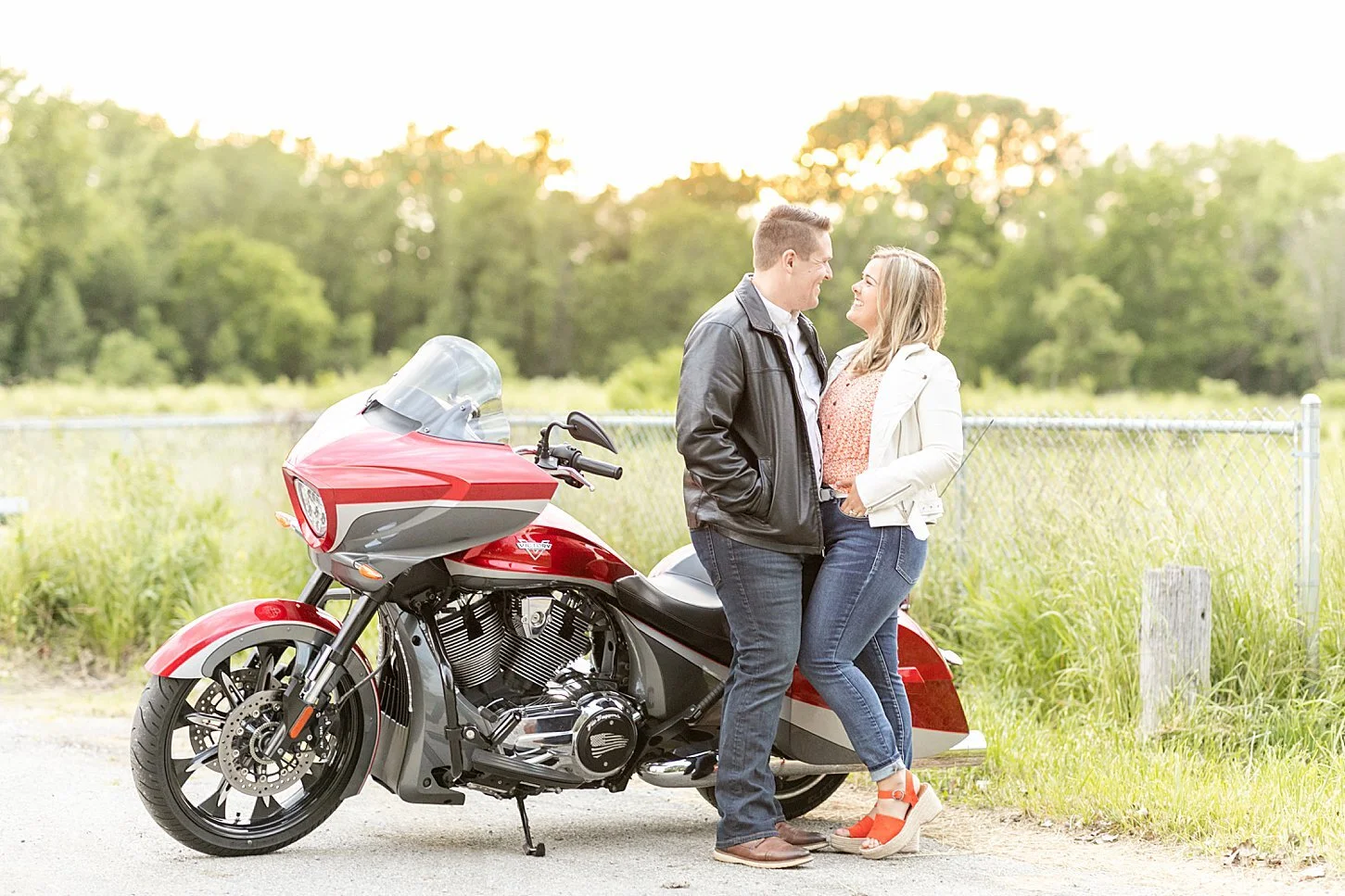 We finished at the park with about an hour left until sunset and we headed to the second half of the shoot. Amanda had told me about their vision for the last half and I was SO excited for it. It was definitely a “first” for me! Nick has a motorcycle that they ride all the time together, so they wanted to bring that into the shoot to have photos that were unique and personal to them! I have never done a shoot with a motorcycle before so it was super fun for me to get my creative juices flowing with something new! I LOVED how they turned out! Honestly, this whole shoot was amazing and I loved every second of it!