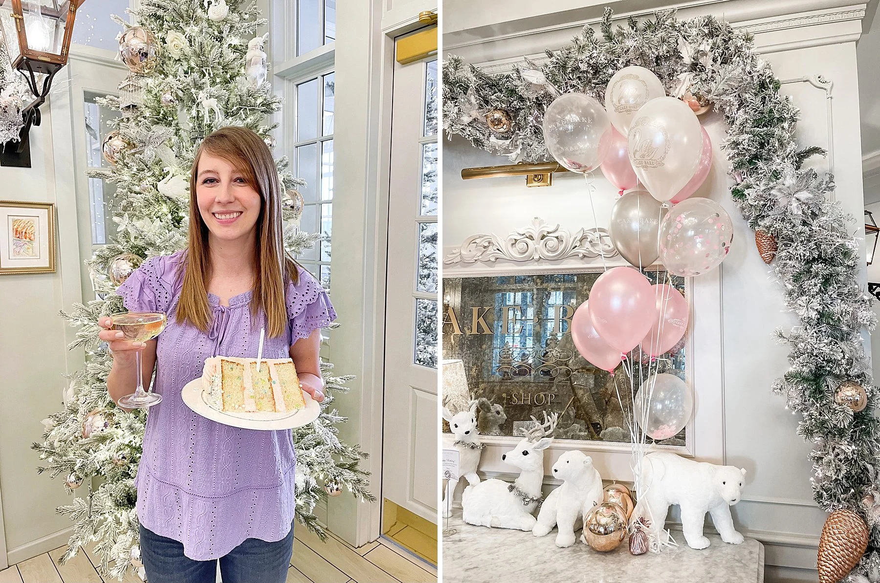 As I was doing my research to find places to explore in the Indy area, I came across Cake Bake and I instantly was in love! The giant slices of cake, the sparkly decor, everything is so bright and beautiful inside— I HAD to go! (We went on the last day of the holiday decor (2-27) and they switched over to spring that evening so they are constantly changing it around through out the year which is so fun!) I decided that this would be our first stop of the day to kick it off with birthday cake and champagne! As soon as you walk in, you are greeted with this aroma of sweets, the marble flooring in the entryway, and the employees in the cutest pink outfits and everyone just seemed so happy to see you! They take reservations (which I recommend doing!!) and book up WEEKS in advanced, but since we had around a 2.5 hour drive I wasn’t sure what time we would actually get there so I didn’t make one. I was fully prepared to just order a slice to-go but they have the option of sitting at the full service bar which got us a seat right away! (score!!)