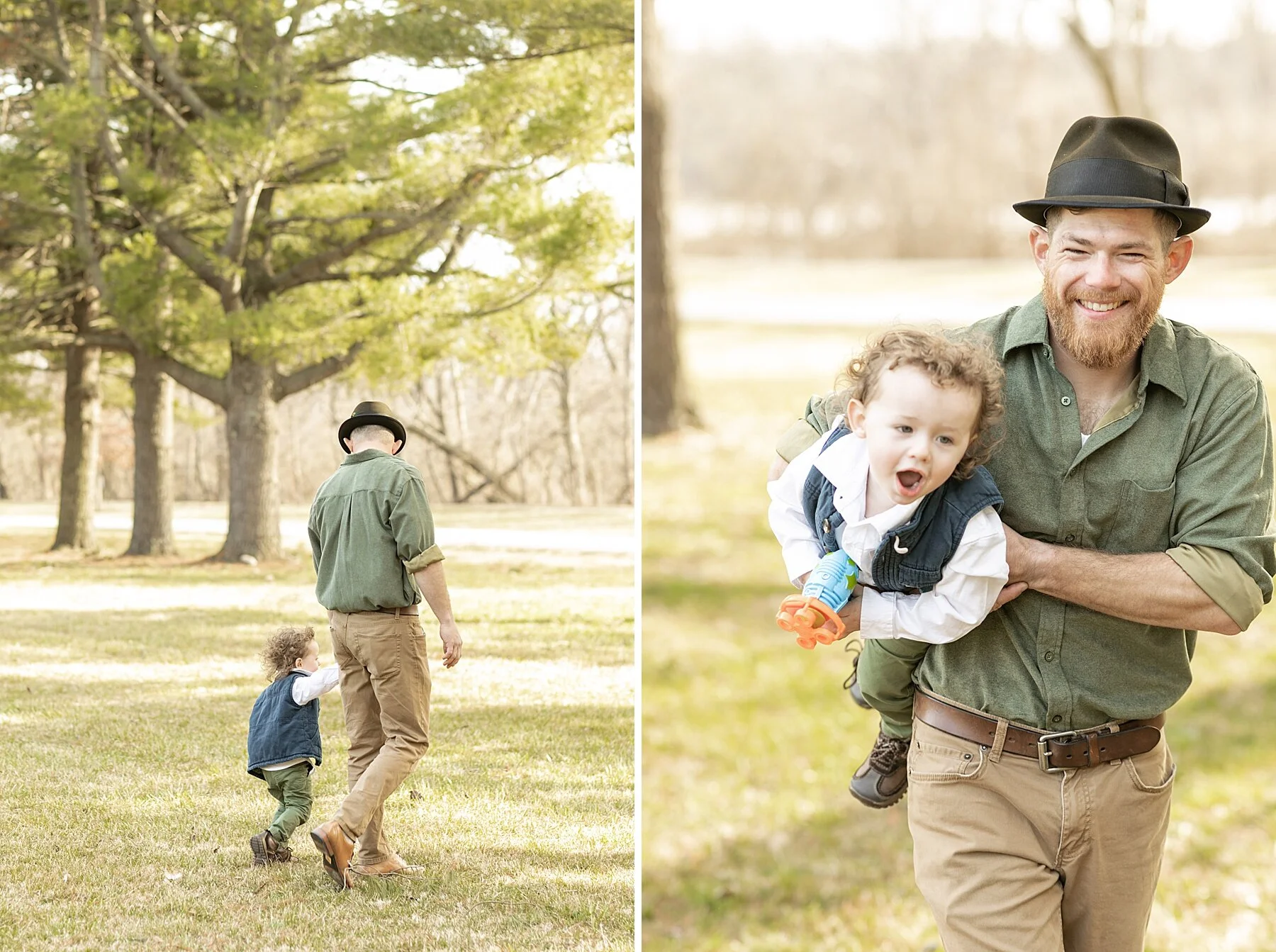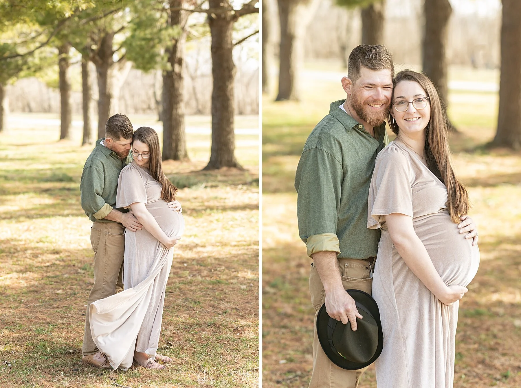 Once again, they all arrived in amazing outfits! Felecia sent me a photo of her velvet dress and I was so excited to photograph her in it! She has such great taste in maternity dresses! She was just glowing! Also, little Auggie in his olive green pants and navy vest- I was OBSESSED! Another thing that made an appearance, Tony’s fedora hat! He totally rocked it and definitely gave BOTH of their sessions more of an editorial look! The colors of their outfits looked amazing in the location that we picked out together! They wanted this shoot to take place at the Kankakee River State Park because this is where they frequently visit and have little family adventures! Love that!! (gimme alllll the forest sessions!)