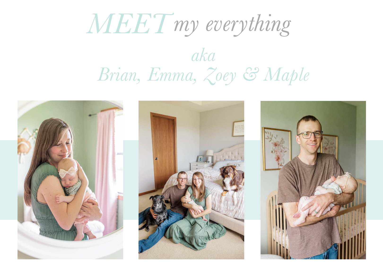 Brian and I have been together for over 15 years and we finally tied the knot in October 2017! I always dreamed of an outdoor fall wedding and it was one of my most favorite days! You can take a peek at it over on the blog HERE! ) We both love hiking, being outside, exploring new places and loving on our little family we have built together. We became dog parents in 2014 to our lab/doxin mix Zoey and was our little companion who came with us EVERYWHERE. She was our whole world! In 2023 we decided it was time to give Zoey a little bestie and our Australian Shepard Maple joined the family. We waited a few years and finally upgraded our titles from dog parents… to hooman parents. Our greatest titles we will ever have. Mom & Dad to our baby girl Emma who arrived in March 2025 and has been the light of our lives!